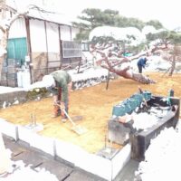 植栽する部分には植栽用の客土が敷かれ、コンクリート工事が行われる部分には砕石が敷かれるとだいぶ庭の輪郭が見えてきました。