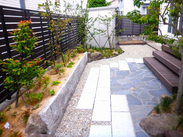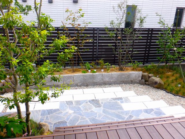 モミジの下には苔を張り、苑路にはテラスと同じ白御影の敷石を張った為に、