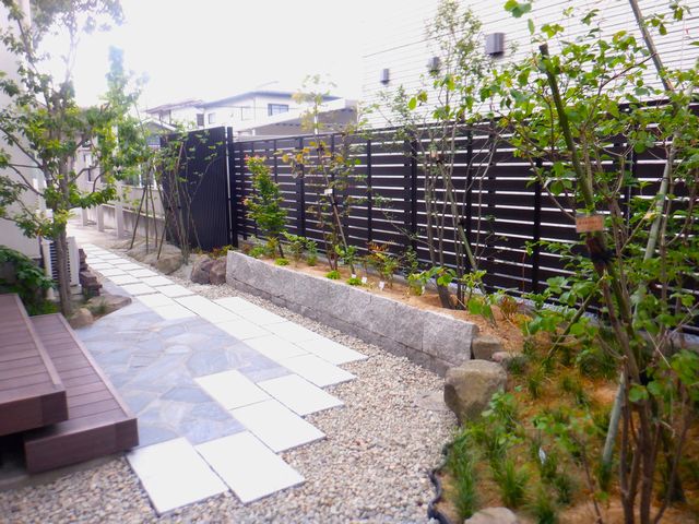 白御影の敷石と自然を張ったテラスができたおかげで、