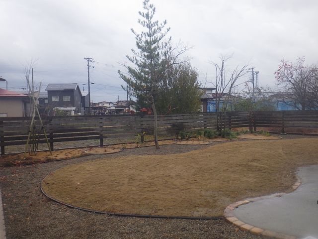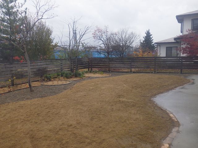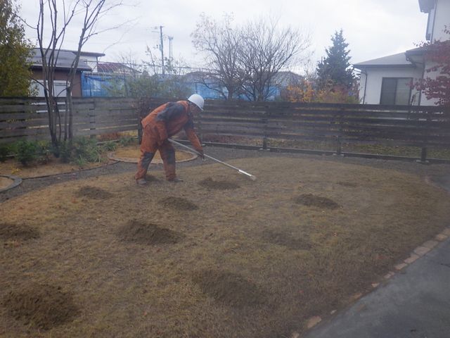 最後に既存の芝生に肥料を撒いて、目土をかけて完成しました。