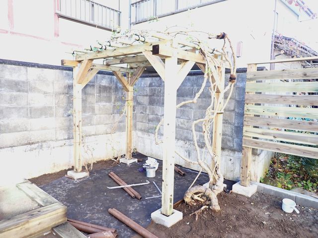 この庭の見せ場の一つのアケビ棚が出来上がりました。
