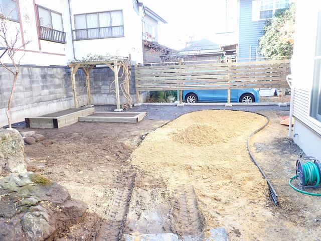 庭の中央には芝生広場が設けられるので、順次その部分の土を入れていきます。