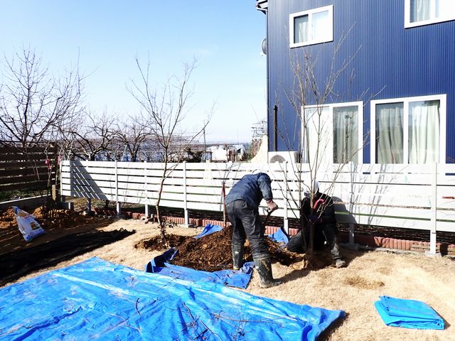 次に庭のイメージが劇的に変わる、樹木の植栽を行いました。
