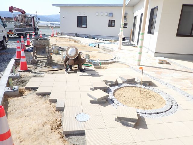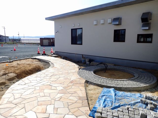 自然石の乱張や、小舗石の円型花壇、化粧平板の取り付けなど、
