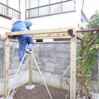 鳥海石を使って、崩れ石組を高さ平均70cmに組上げ、その上にツゲを移植して生垣を設けました。そうする事によって地面より150cmの高さまで遮蔽しました。