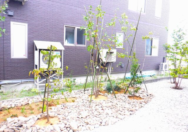 【before】 【after】 雑木類を5本、多年草の混植2ヶ所、 それ以外は防草シート+山砂利or玉砂利敷でシンプルにまとめま...